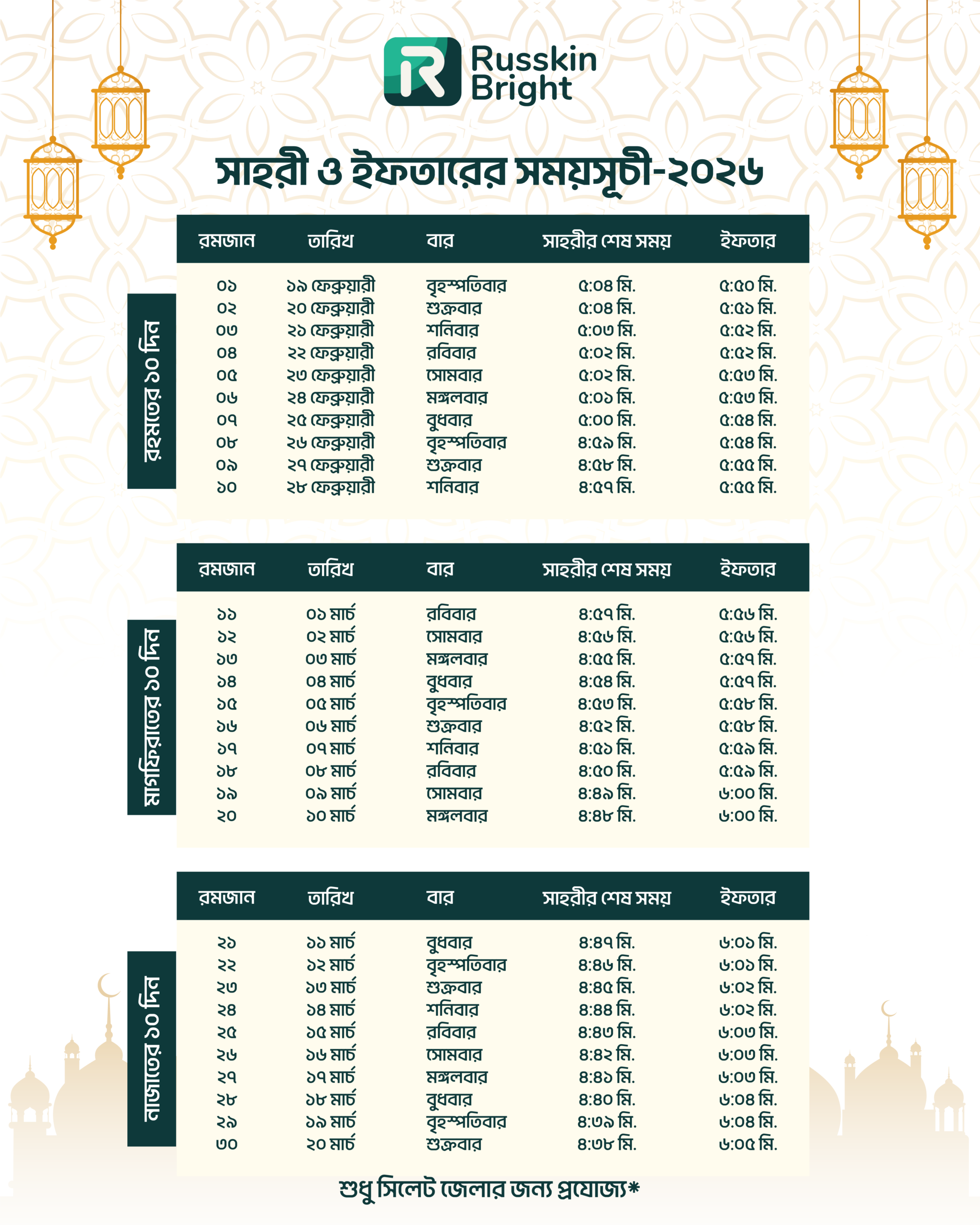 সিলেটের জন্য নির্ধারিত সেহরি ও ইফতারের সময়সূচি আগামী ২০ মার্চ পর্যন্ত কার্যকর থাকবে। ইসলামিক ফাউন্ডেশন জানিয়েছেন, আগামী দিনে সময়সূচিতে কোনো পরিবর্তন হলে তা স্থানীয়ভাবে সংবাদ মাধ্যমে এবং মসজিদ-মাদ্রাসার মাধ্যমে জানানো হবে। রোজাদারদের জন্য এটি নিরাপদ ও স্বাচ্ছন্দ্যময় রোজা পালন নিশ্চিত করার উদ্দেশ্যে।