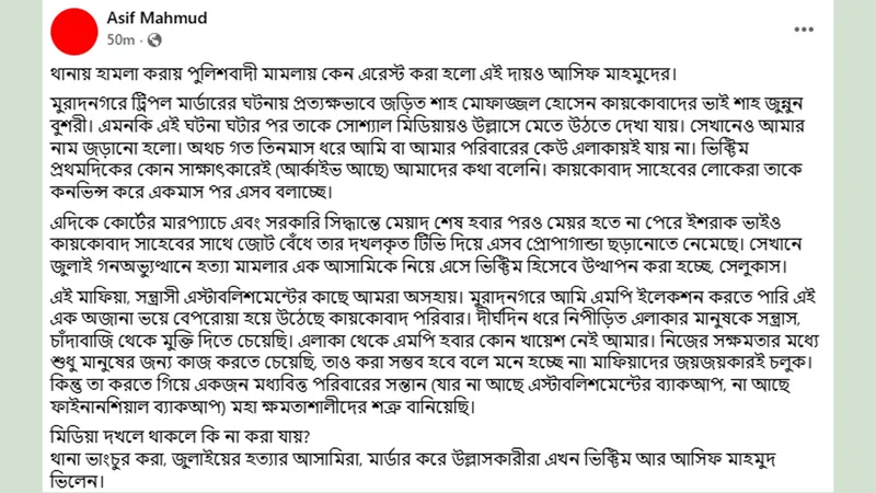 সামাজিক যোগাযোগমাধ্যমে এই দীর্ঘ পোস্টে আসিফ মাহমুদ সরাসরি অভিযোগ করেন, তাকে বিভিন্ন অপরাধের সঙ্গে জড়িয়ে ফেলা হচ্ছে উদ্দেশ্যপ্রণোদিতভাবে। যেমন, থানায় হামলা সংক্রান্ত এক মামলায় তার নাম জড়ানো, মুরাদনগরের আলোচিত ট্রিপল মার্ডার কাণ্ডে কায়কোবাদ পরিবারের সম্পৃক্ততা থাকা সত্ত্বেও তাকে ইচ্ছাকৃতভাবে টেনে আনা, এসব সবই রাজনৈতিকভাবে তাকে দুর্বল করার অপচেষ্টা বলে তিনি মন্তব্য করেন।