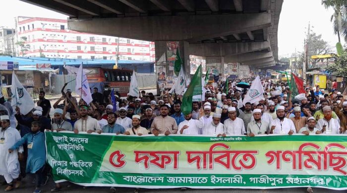প্রকাশ: ১০ অক্টোবর ২০২৫ | নিজস্ব সংবাদদাতা | একটি বাংলাদেশ অনলাইন গাজীপুর মহানগর জামায়াতে ইসলামী শুক্রবার সকালে পাঁচ দফা দাবিতে গণমিছিল করেছে। মিছিলটি টঙ্গীর শালিকচূড়া এলাকা থেকে শুরু হয়ে ঢাকা-ময়মনসিংহ